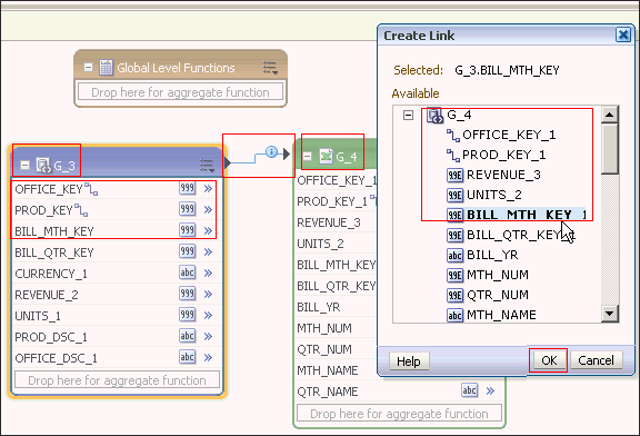 | 19 . | a. The Create Link window is displayed with the available data for linking.![]() For this example, select OFFICE_DSC from the data set G_2. b. Click OK. |