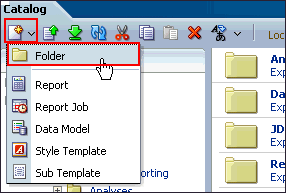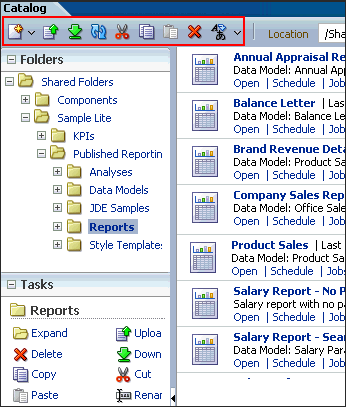 | 1 . | The Catalog page is displayed as a tree structure on the left side of the page with the details on the right. The catalog stores the BI Publisher objects, such as reports, data models, and style templates. The catalog page has a tool bar with various task icons such as New, Upload, Copy, Cut, Paste, and other options that can be used when creating or managing the catalog objects such as data models and reports. |