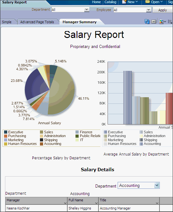| 2 . | Use the Folders pane of the Catalog page to display and navigate the content. To open the report Salary Report - No Parameters, select the report under the Shared Folders/Sample Lite/Published Reporting/Reports folder, and then click Open. This will open the selected report in the Report Viewer as shown below. |