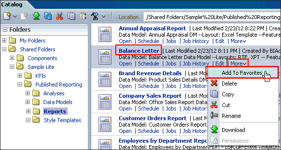 From the Favorites region, you can Schedule, Configure, Remove, and See Job History or Edit the objects that you have placed there.