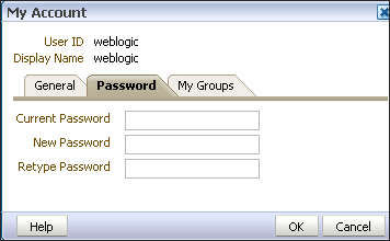 | 3 . | Click the Password tab to reset the password. Note: If your account password settings are inherited from another application such as Oracle BIEE, then you cannot update your password here. |