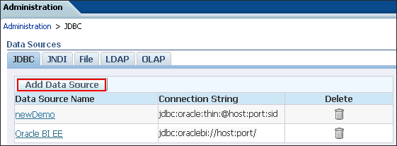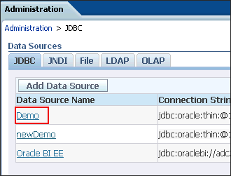 | 2 . | This displays the Data Sources page. Observe the available Data Source list. Oracle BI EE is configured out of the box, if Oracle BI Publisher is not a stand-alone install, but part of the OBI EE install. On the JDBC tab, click Add Data Source to create a JDBC connection to connect to Oracle Database. |