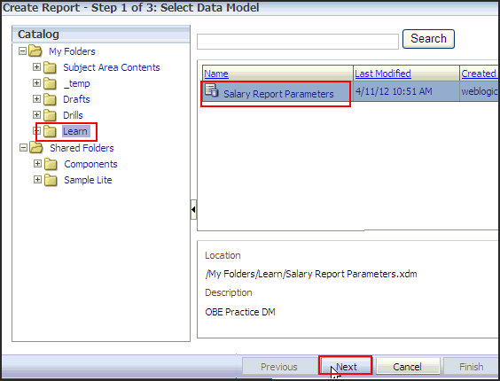 | 2 . | Select the previously created data model Salary Report Parameters from the Learn folder. Click Next. |