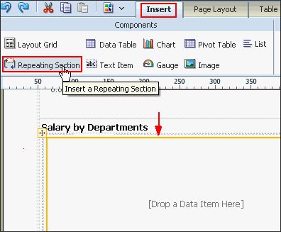 | 9 . | Now you will add the data table for Salary by Departments. You will use "Repeating Sections" and "Data table" elements. a. Under the Salary by Departments grid cell, click Insert>Repeating Section. b. In the Insert a Repeating Section editor window, select Element, Row, and DepartmentName. Click OK. The Repeating section is inserted. |