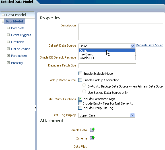 | 2 . | In Data Model Editor, observe the Data Model Properties section that is displayed on the right. Select a Default Data Source (that points to the database that you have been earlier connected to). In this example, you will use Demo. Optionally, you can add a description to the data model. Note: Ensure that in the XML Output Options, the Include Parameter Tags is checked, and the Include Empty Tags for Null Elements and Include Group List Tag check boxes are not checked. |