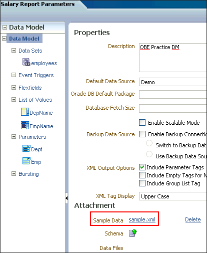 | You can see that the sample.xml is listed in the Sample Data section of the Data Model (as shown below): Note: It is very important to save sample data for a data model. Otherwise, when creating Layouts, the previews do not appear correctly. This concludes the topic of creating a new Data Model with Parameters and List of Values. You will use this data model in the next topic to create a new report. |